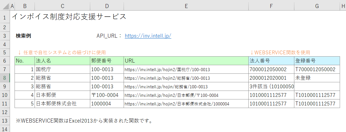法人番号の取得「=WEBSERVICE("https://inv.intell.jp/hojin2/[法人名]/[郵便番号]")」